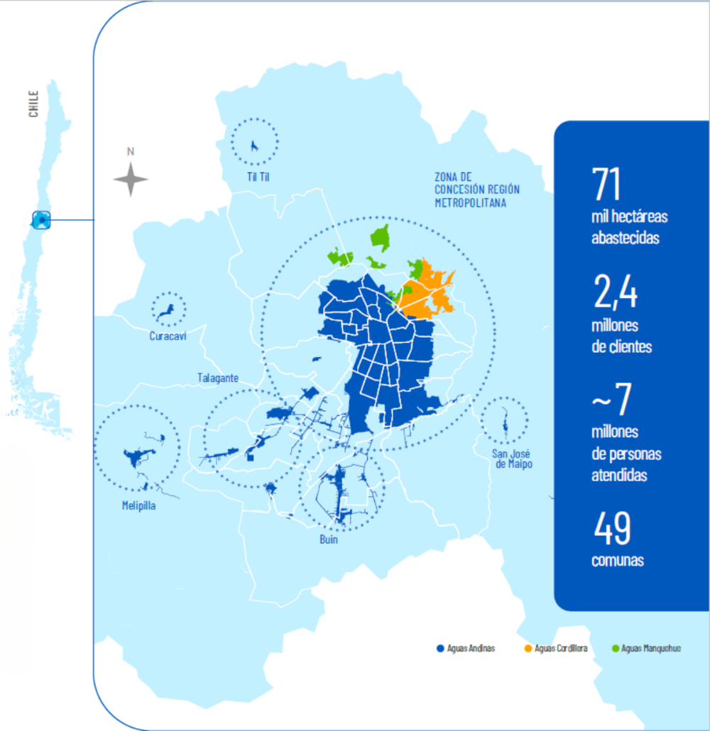 Estos clientes se encuentran distribuidos en sus zonas de concesión, que abarcan un territorio de 71 mil hectáreas ubicado en la Región Metropolitana.