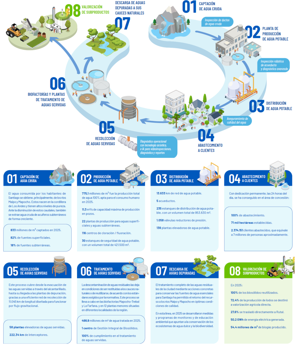 Las empresas reguladas del Grupo Aguas gestionamos integralmente el ciclo del agua, Este proceso incluye la captación de agua cruda, producción, transporte y distribución de agua potable, y recolección, tratamiento y disposición final de aguas servidas.